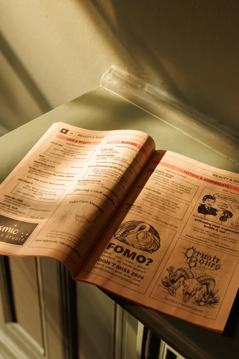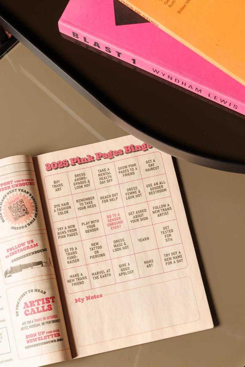 The Austin Trans Pink Pages is only available in print. There’s no PDF or online version. This limited accessibility feels true to our yellow pages inspiration, and it roots us in connection and community. You can get a free copy by attending any Gender Unbound event; we also have a few community distributors with physical spaces who stocked some copies. Or, get it from a friend—we encourage folks to share and pass this publication around.